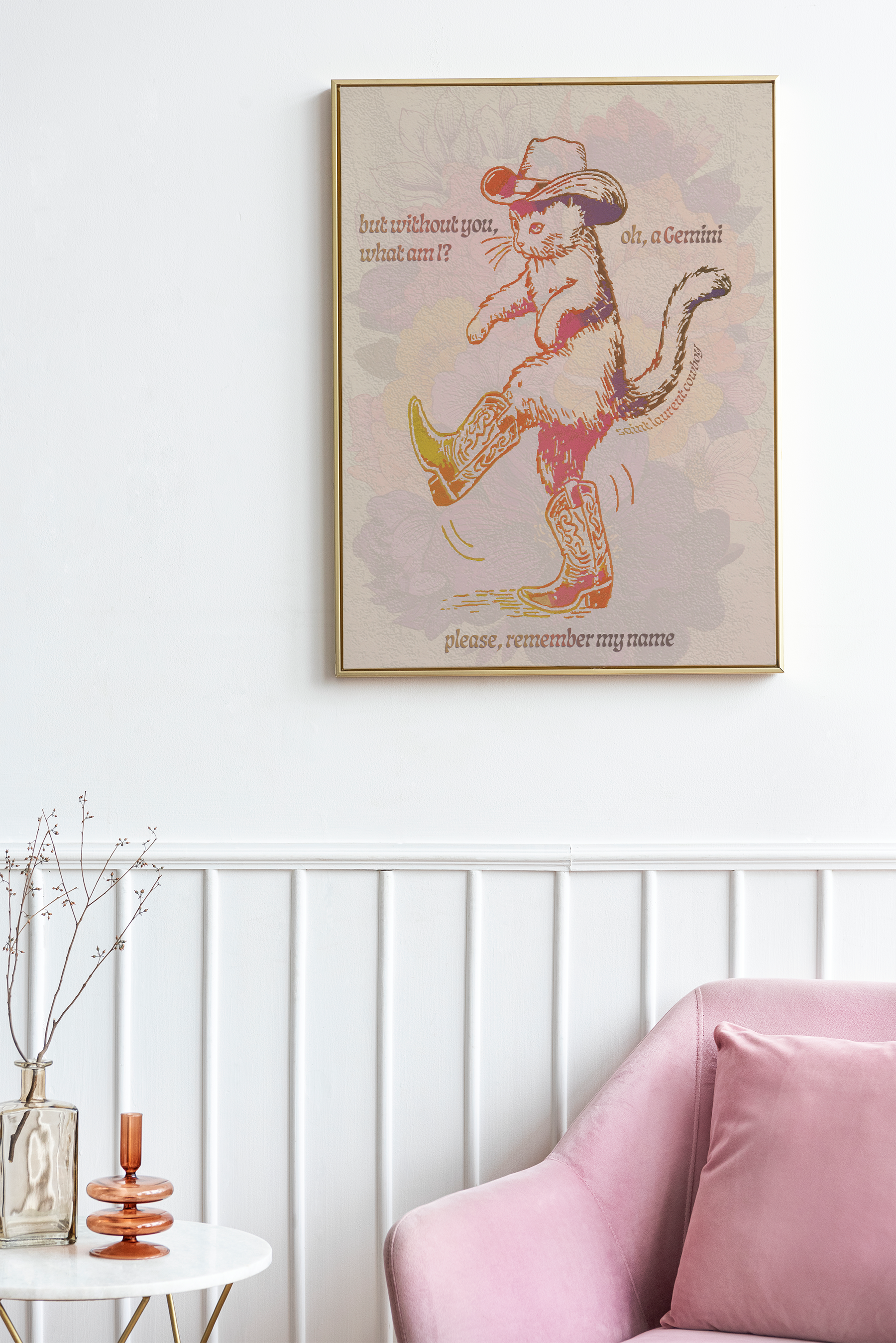 Your two favorite divas, St Laurent Cowboy and a kitty cat. Inspired by my roommate's cat, Gemini.